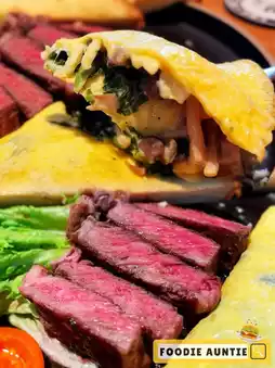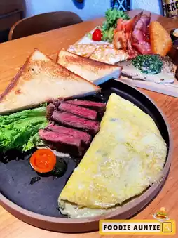 🥩 My friend is a carnivore so I must order this "Omelette & Steak Combo", which has an omelet made of three eggs, plus tendon steak and toast. The steak meat is super tender and juicy! The most sincere thing is to choose the filling on the side of the omelet, there are three choices, chose the mushroom cream spinach cheese flavor! The omelet is full of rich cream cheese flavor, full of mushroom aroma, high quality!