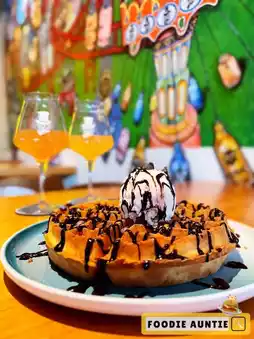 🧇 Talk more and more hungry, make another dessert for two portions. This "Happy Day Waffle" is super thick and big! The surprise was the unexpectedly fluffy and bouncy, which was perfectly finished with a large ball of vanilla ice cream, chocolate chips and chocolate sauce.