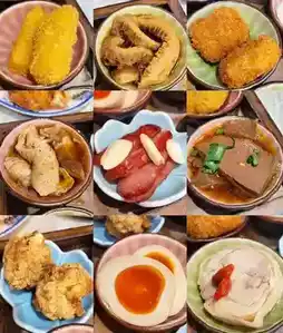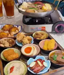 (salted chicken, beef belly, pork large intestine, chicken rolls, boiled egg, sausage, sweet potato cake, crispy fish pieces, spicy duck blood)