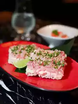 Thick crispy rice crackers topped with smooth and fresh tuna belly paste and scallions, a must-try snack😚