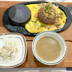 A large round wagyu beef medium-sized hamburger steak, topped with cheese and garlic slices, looks very attractive. Then chicken liquid is put on the iron plate. The heat of the iron plate turns it into a very fragrant fried egg. As for the main hamburger steak, you need to put it on the hot stone and heat it yourself. You can cook it as much as you want. It has a smooth texture, and the cheese makes the wagyu beef even more delicious🥰