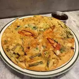 This is a dish based on onion cake with fresh seafood (such as shrimp and squid).