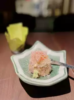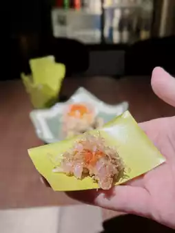 Large pieces of squid topped with crab meat and shredded wood fish wrapped in green bean flakes