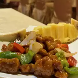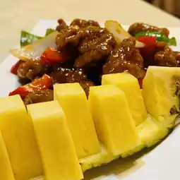 Favorite pineapple is with fresh, fresh and juicy, sweet and sour pork crispy outside and soft inside, the meat is half fat and lean bite-sized meat, refreshing and bouncy, hawthorn sweet and sour sauce seasoning just right, sweet and sour taste is very appetizing, accompanied by fresh green and red peppers and onions, must-eat