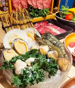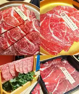 Our "M9 Australian Wagyu All-You-Can-Eat Meal" includes a variety of beef, such as Australian M9 Wagyu, American Excellent Beef Shoulder, Australian Special Beef, Angus Beef, American Beef Tendon, Beef Brisket 🥢 There are also American Pork Plum, New Zealand Lamb Roll and Grandma Roast Wine Chicken to choose from. Australian M9 Wagyu is a must-try, the fat distribution is just right, the oil is as strong as the beef flavor, the meat is fresh and sweet without dipping sauce to eat just as good ~ American excellent beef shoulder meat also belongs to the high-end beef parts, juicy and tender, also highly recommended! The other fairy beef served is richer in fat. The beef is served on a wooden frame, with large pieces of fairy beef hanging vertically on it. It's very impressive and great for taking pictures!