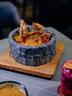 The whole fried soft shell crab looks great The fried powder is not thick at all and tastes very crispy The thin pasta is refreshing with chili and garlic flavor The mussels are already peeled off the shell and are convenient to eat🙈