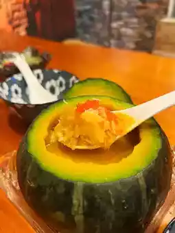 A whole pumpkin served at the table, with pumpkin puree paired with crab meat and crab roe, rich in taste and delicious.