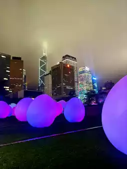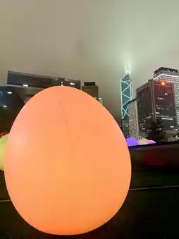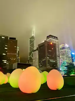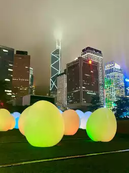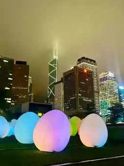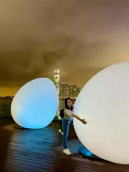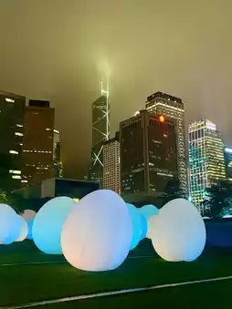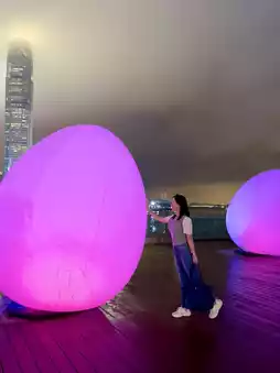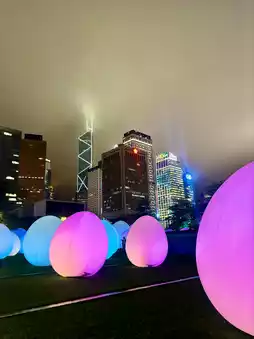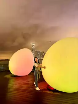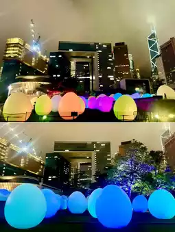 In order to protect the artworks, many art exhibitions will put up fences in front of the artworks, but this art exhibition is rare in that there is no fence to separate visitors and artworks☺️. Visitors can interact with the egg-shaped objects. When they touch the exhibits, different light, color and sound effects will be produced, which echo the night scenes of Admiralty and Central and the night scenes on the other side of the river.