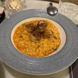 The scallops are crispy and bouncy, and each grain of risotto is covered with seafood broth.