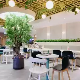 The restaurant has a row of floor-to-ceiling glass with plenty of light