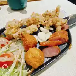 Soy milk fried chicken + fried cuttlefish balls + sausage