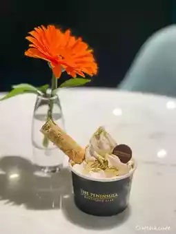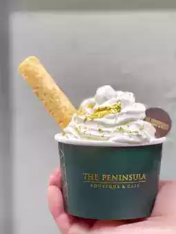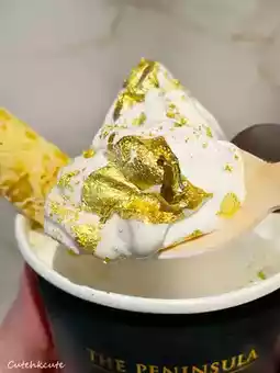 A friend of mine was visiting Hong Kong, and after seeing an exhibition at the Tsim Sha Tsui Art Museum, we went to the Peninsula Boutique and Cafe to try the limited-edition 51 Gold Foil Hokkaido Milk Ice Cream, a taste of Hong Kong's vintage charm. This gold-leaf ice cream is rich in gold, with a three-layered texture. It features rich, smooth milk, walnut crisps, and a crispy butter roll. And surprisingly, there's strawberry sponge cake at the bottom. It's both beautiful and delicious, and I wanted more after finishing one.