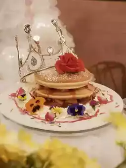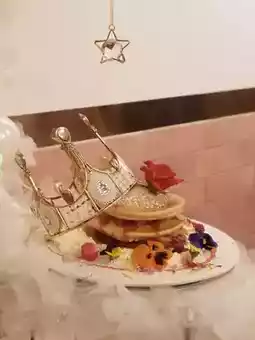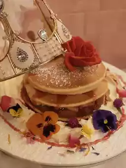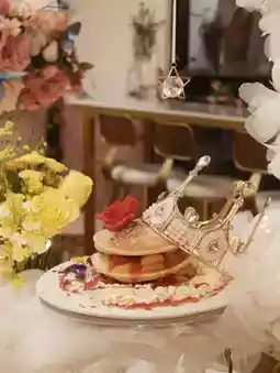 🤩The plating includes a crown👑, white feather stand, and fresh flowers💐, scoring full marks for social media check-ins💯! The pancake🥞is thick and fluffy, with fresh strawberries and sauce in between, slightly sour and sweet, perfect for both a photogenic and satisfying dessert.