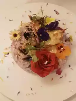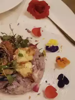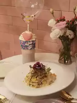 🤩The presentation is stunning, as exquisite as a piece of art😍, decorated with a variety of fresh flowers, roses, and gold leaf. Hidden inside are two grilled cheese prawns and three mussels, with a base of creamy risotto that's plump and soft, satisfying and photogenic☺️.