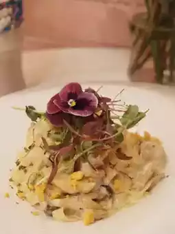 The plating also uses fresh flowers and butterflies, catching the eye😍, making it hard to start eating. The portion is just right, 😋the pappardelle is tender and holds the sauce well, the chicken is tender, and the salted egg yolk is fragrant, mixing together for a very flavorful taste🤤.