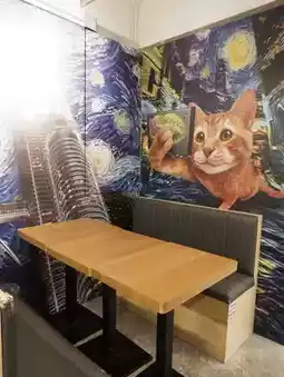 🏠Environment: The establishment is two stories high, with two British Shorthair cats on the upper floor, which are cute but a bit shy. The upper floor is L-shaped, with drawings of One Piece on the windows of both bar counters. The staircase is decorated with neon lights, while the ground floor has bar tables and booths, with walls adorned with Food Ghost game drawings, and the space is not very large.