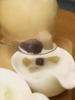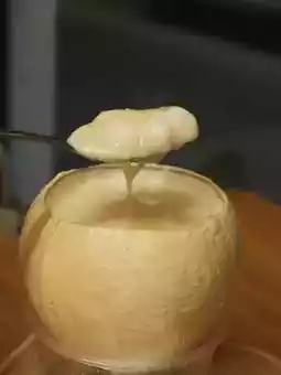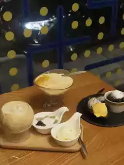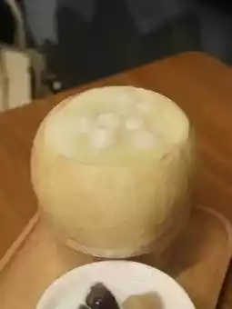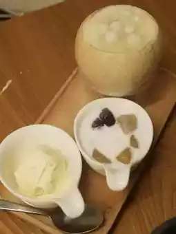 A small coconut shell filled with durian ice cream and tri-color coconut taro balls, topped with tapioca balls, containing durian flesh, sago, and steamed egg, every bite tastes of durian🤭, very rich in flavor🤤. Although the portion is not large, it is quite filling😆.