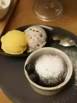 Choose two types of ice cream: 🥭mango and 🍪cookie, served with a hot chocolate lava cake. Pour and cut by yourself, the flowing chocolate sauce is very soothing🥰, with a moderate sweetness🫶🏼, the chocolate taste is rich but not bitter😋, and when combined with ice cream, it creates a sensation of hot and cold🤩.