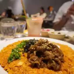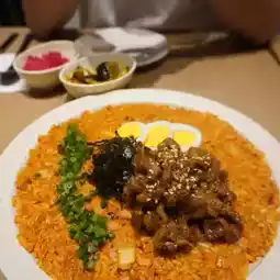 The fried rice is pressed flat and placed flat on the plate, plus mixed with kimchi, eat spicy, with eggs 🥚 seaweed, beef, the portion is super much!
