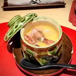 The smooth steamed egg is served with Toyama Bay fluorescent squid, which is smooth. Which adds lily, winter mushroom, and grapefruit peel to add a lot of fragrance.