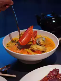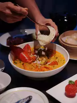 Lobster soup and seafood rice: The soup base is made with fresh lobster, which is sweet and rich, leaving you with an endless aftertaste. The rice porridge is rich in ingredients, including half a lobster, 1 abalone, 1 mussel and 2 shrimps, and is very delicious. The lobster meat is tender and chewy, the abalone has a crisp texture, the mussels are sweet and juicy, and the shrimp meat is delicious and tender. The rice is soft and delicious, and blends perfectly with the soup. Every bite is a treat for your taste buds.