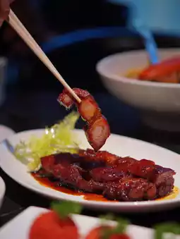 Roasted candied pork with barbecued pork: The barbecued pork is tender and juicy, with alternating fat and lean parts. The sweetness of the candied fruit is perfectly integrated into it, leaving a lasting aftertaste. The barbecued pork exudes an enticing aroma. The meat is fatty but not greasy, lean but not dry, and melts in your mouth. The sweet and sour taste of the candied fruit enhances the flavor of the barbecued pork.