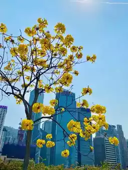 The lawn is green and perfect for picnics. Against the backdrop of the dazzling skyscrapers in the distance, it forms a moving urban landscape painting. Various brightly colored flowers are planted along the road, swaying gracefully in the breeze.