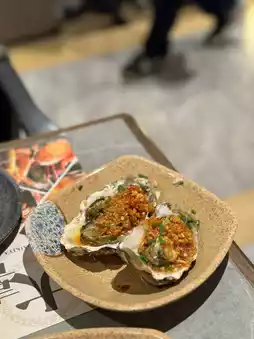 Snacks with wine include salt grilled chicken cartilage, beef tongue, grilled oysters🦪, large full oysters full of fried garlic, rice and peppercorns aroma. It can be seen that it is really grilled over charcoal fire! Very delicious! There are also tempura, especially recommended fried thin super crispy tiger prawns, and Japanese air-freight sweetheart sweet potatoes, great!