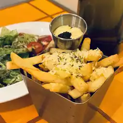 The steak with french fries is a must, the fries are freshly fried and sprinkled with cheese, most like this variety of cheese is very crunchy, dipped in black truffle sauce, delicious