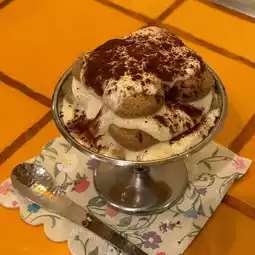 Sincerely made to order, with espresso covered with Italian finger cakes with mascarpone cheese, eggs, rum, cocoa powder, very smooth, rich coffee aroma, really delicious