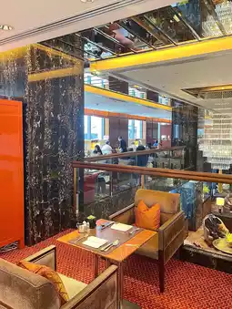 The Clipper Lounge, located on the mezzanine floor of the Mandarin Oriental, Hong Kong, is decorated in orange and brown tones, exuding a classic and elegant ambiance🧡