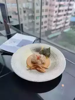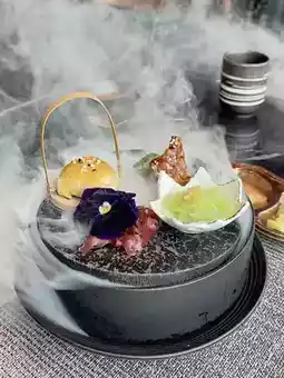 The starter uses dry ice to create a fairyland-like visual effect 🤩 The three dishes include the appetizing grapefruit-flavored cold noodles <槐叶冷淘-Du Fu>, the crispy and delicious lotus-smoked pomfret , and the crispy and delicious red vegetable crisps 😋