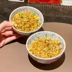 The chef's skill in frying rice is excellent, finishing with a heart shape. The rice is dry and grains are distinct, mixed with high-quality sakura shrimp, adding a fragrant shrimp flavor and color to the dish.