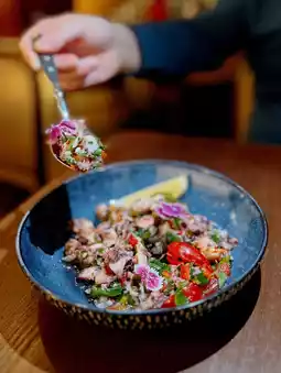 Cut the octopus into pieces and stir-fry the olive and coriander together. There are also cherry tomatoes and onion pieces. The flavor is very multi-layered๐