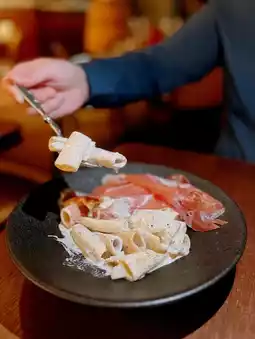Uncover the bacon slices under the aroma of black truffle cheese sauce mixed with macaroni The taste is quite rich not eaten already has a fragrance overall very Creamy๐ซ