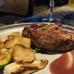 Served with fried potatoes, spring onions, and red wine pear sauce