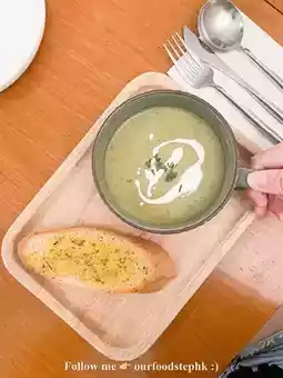 ‣ Broccoli cream soup ∙ garlic bun ∙ matcha cheesecake ∙ iced lemon tea (+$40 upgrade package)