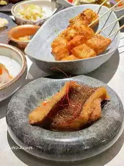 ✅ Grilled satay skewers ✅ Thai shrimp with black sauce ✅ Lemongrass chicken wings ✅ Red brick tofu ✅ Spicy crispy shrimp chips ✅ Pork neck, papaya and pomelo salad ✅ Crispy golden fish. Free refills are available! 😱