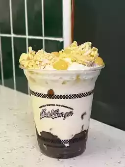The surface is filled with the common rice noodles and cream in smoothies, coconut milk is used instead of red bean ice cream, the bottom layer is red bean puree with chan pi ๐ซ Overall, it is a very interesting combination, worth a try ๐คฉ