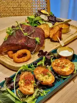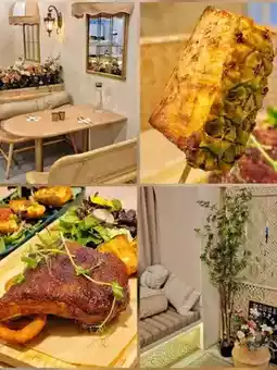 For the main course, I ordered the baked pork ribs. The BBQ sauce is flavorful, the meat isn't too dry, and it separates easily from the bone. It's served with sweet roasted pineapple, crispy onion rings, and a side salad.
