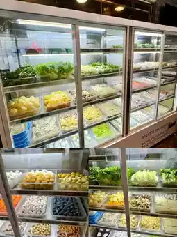 The buffet area on the other side has a variety of vegetables, meatballs, hot pot ingredients, etc., the choice is quite rich.