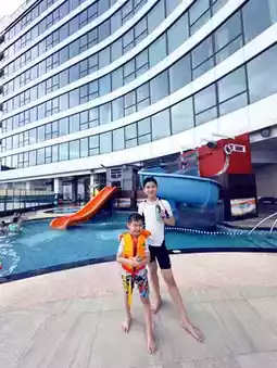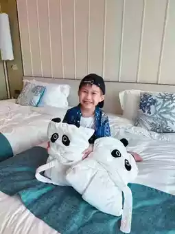 The hotel has a swimming pool for guests to enjoy for free. The swimming pool faces the sea view and there is also a paddling pool. Children have a lot of fun and fun! In addition, I really appreciate the panda theme. The restaurants and hotels have panda-themed decorations and arrangements. There are even pandas taking photos with us. It feels very harmonious and warm. Although I was a little disappointed not to be able to stay in the panda-themed room this time, I was very satisfied with the overall cleanliness of the room, and the mattress and pillows were also very comfortable!