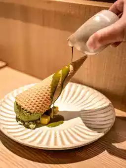 The signature dessert here, matcha ice cream cone drizzled with matcha sauce, a must-try for matcha lovers!