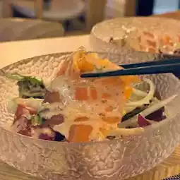 Fresh vegetables with a sesame salad dressing are rich and appetizing, paired with large pieces of smoked salmon that instantly opens the taste buds
