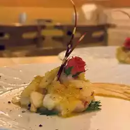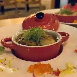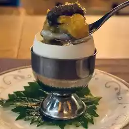 The stunning taste is on this egg, topped with fresh seaweed, full of crab meat, black truffle sauce and edible gold foil