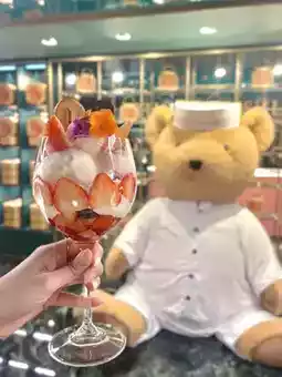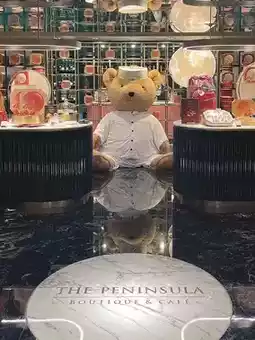 The Peninsula Boutique & Café is divided into two sections. The café features an elegant jade green decor 💚, while the boutique offers a variety of cookie gift boxes, teas, and more. There's even an adorable giant teddy bear for photo ops 🧸💕.
