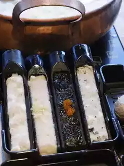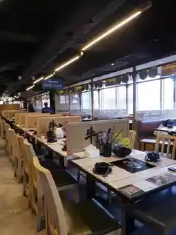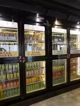 There are sauce areas, drinks and ice cream cabinets, cooked food areas, vegetables and meatballs areas,