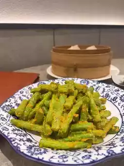 Crush the salted egg yolk and evenly coat each string bean with the salted egg yolk