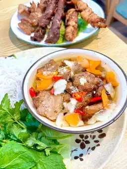 One of the signature dishes, made with various types of pork, including pork balls, pork neck, and pork. The pork is soaked in a special sweet and sour sauce. Each bite of vermicelli dipped in the sweet and sour sauce, accompanied by mint leaves, is particularly appetizing and refreshing.
