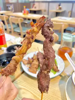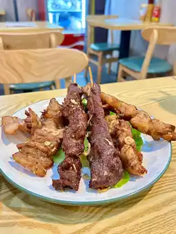 A large version of skewers, each skewer is big, with two large skewers each of chicken, beef, and pork. The meat is tender and well-seasoned.